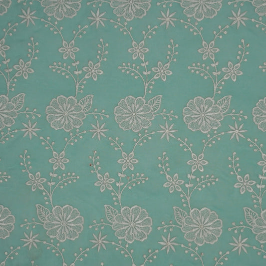 Waniya Turquoise Mul Chanderi Embroidered Fabric in Jaal Pattern