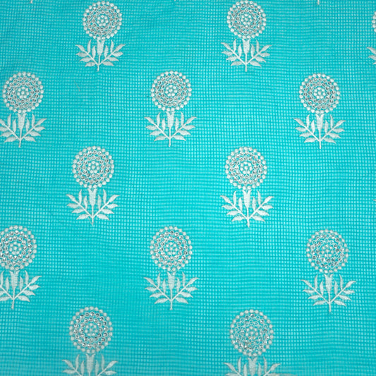 Yatika Turquoise Semi Munga Kota Embroidered Fabric in Buta Pattern