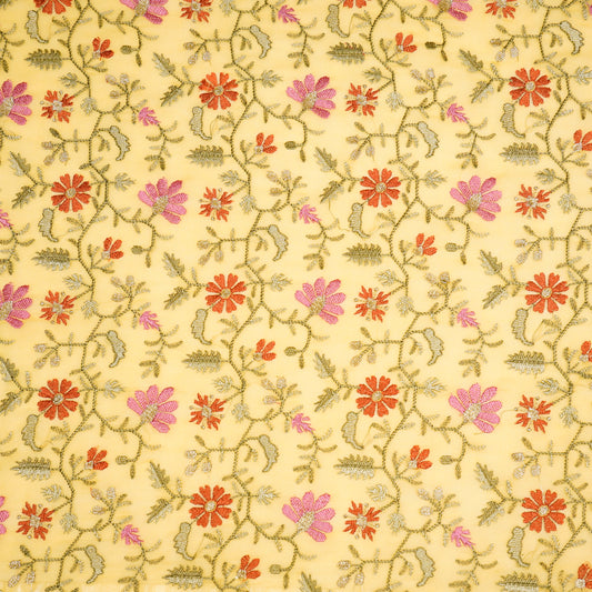 Iqra Lemon Viscose Georgette Embroidered Fabric in Jaal Pattern