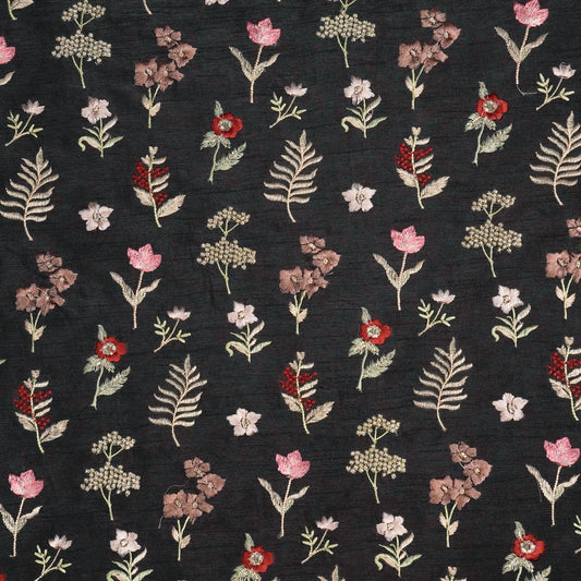 Omera Floral Black Viscose Raw Silk Embroidered Fabric in Tiny Buta Pattern