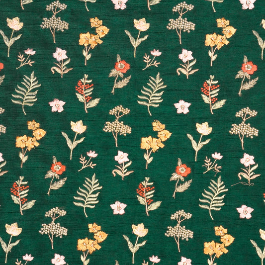 Omera Floral Bottle Green Viscose Raw Silk Embroidered Fabric in Tiny Buta Pattern