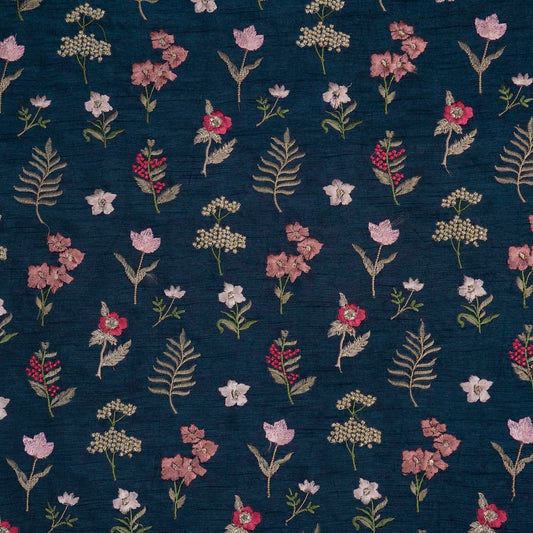 Omera Floral Navy Blue Viscose Raw Silk Embroidered Fabric in Tiny Buta Pattern