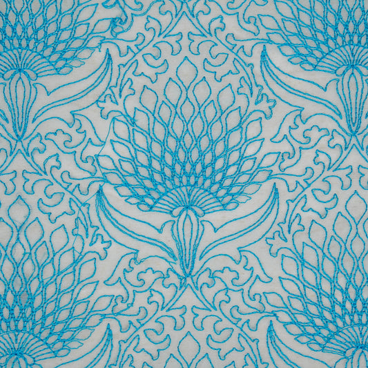 Isra Ivory/Turquoise Chanderi Embroidered Fabric in Jaal Pattern