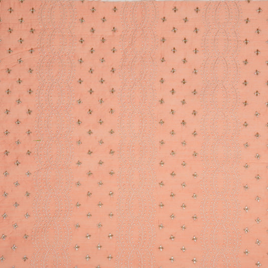 Naira Peach Viscose Raw Silk Embroidered Fabric in Jaal Pattern